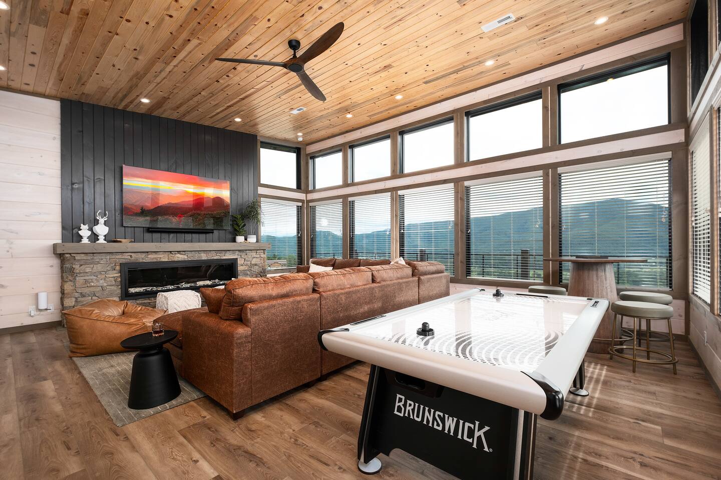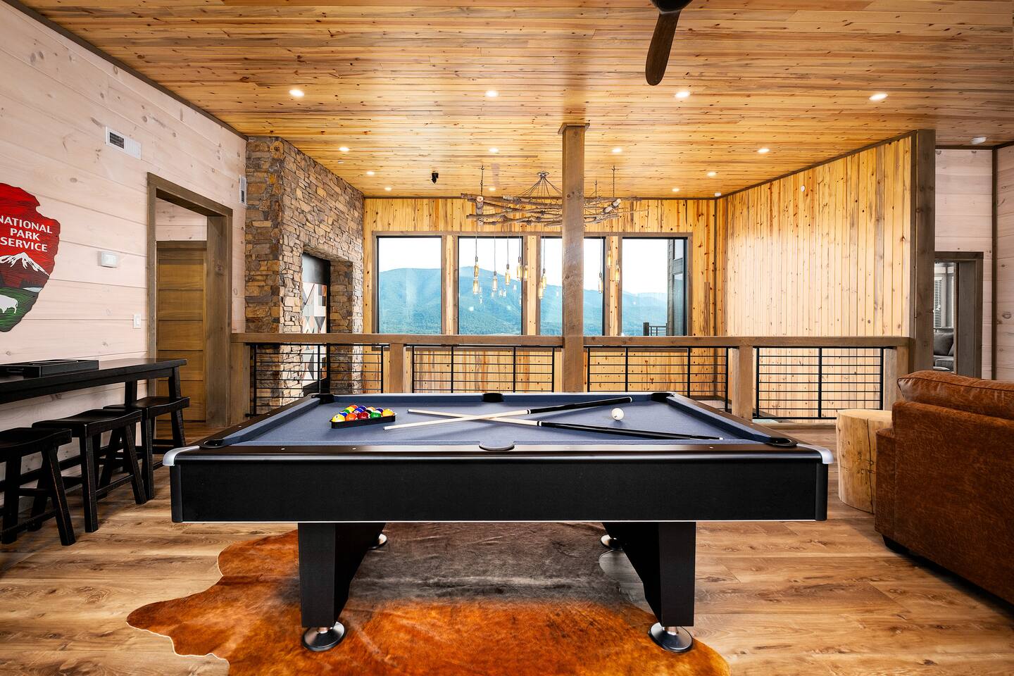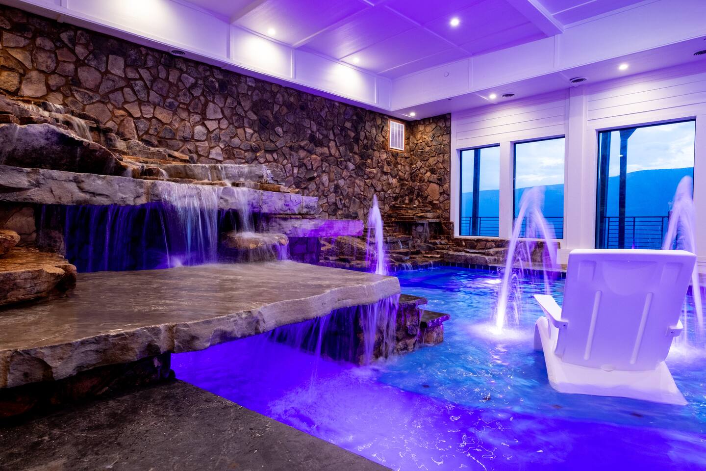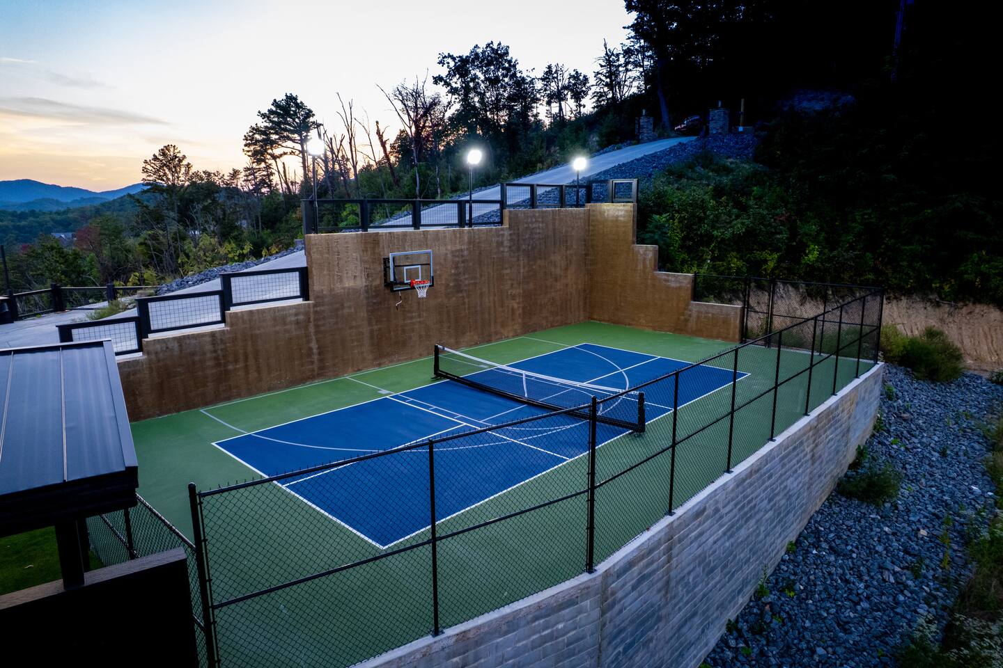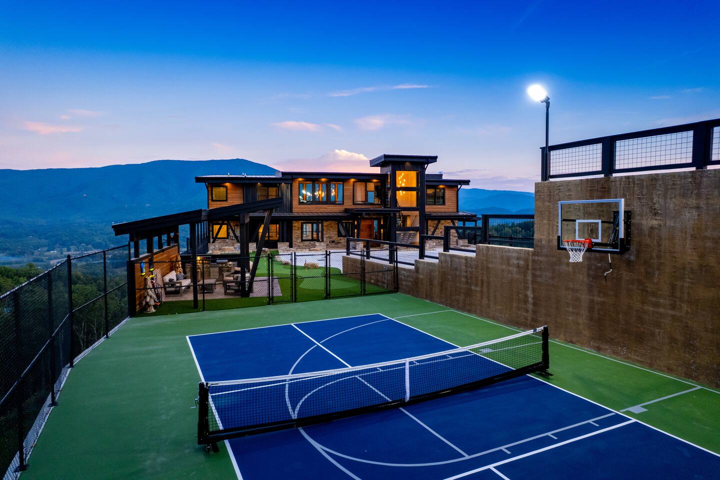 ★ 5 King Suites – Each with fireplace, spa bath (soaking tub & shower), and luxury linens ★ Bunk Room – Sleeps up to 10 kids/teens, with ensuite bath ★ 8.5 Bathrooms – No waiting for showers ★ Private Indoor Pool – One of the largest in the Smokies; lazy river, waterfall, built-in spa, kiddie pool (heated year-round, secured with coded lock & door alarm) ★ Year-Round Outdoor Swim Spa/Hot Tub – Relaxation, hydrotherapy, or resistance workouts ★ Sports Court – Regulation pickleball court (shared with basketball) & 6-hole putt-putt; court lit for night play ★ Game Loft + Media Tower – Pool table, arcade games, air hockey, big screens ★ Chef’s Kitchen – Dual appliances, oversized island, 12-seat dining table, bar seating ★ Multiple Fireplaces – 5 bedrooms + living & media rooms ★ Expansive Decks – Dining, lounge, & firepit seating with panoramic views ★ Covered Outdoor Grill Station – 12-burner gas grill, griddle, lounge area ★ Family-Friendly – High chair, pack ’n play, board games, bunk room designed for kids/teens ★ Designer-Appointed Interiors – High-end finishes and luxury linens ★ EV Charger – On-site for your convenience SLEEPING ARRANGEMENTS Main Level (No-step entry, mobility-friendly) ▪ Bedroom 1: King bed, fireplace, spa bath, deck access ▪ Bedroom 2: King bed, fireplace, spa bath ▪ Bedroom 3: King bed, fireplace, spa bath Upstairs ▪ Bedroom 4: 4 full bunks, full sofa bed, en suite bath ▪ Bedroom 5: King bed, fireplace, spa bath, private balcony ▪ Bedroom 6: King bed, fireplace, spa bath Additional Sleeping ▪ Loft: Queen sofa bed, full bath ▪ Media Tower: Queen sofa bed, private deck, full bath access ▪ Pack ’n play
