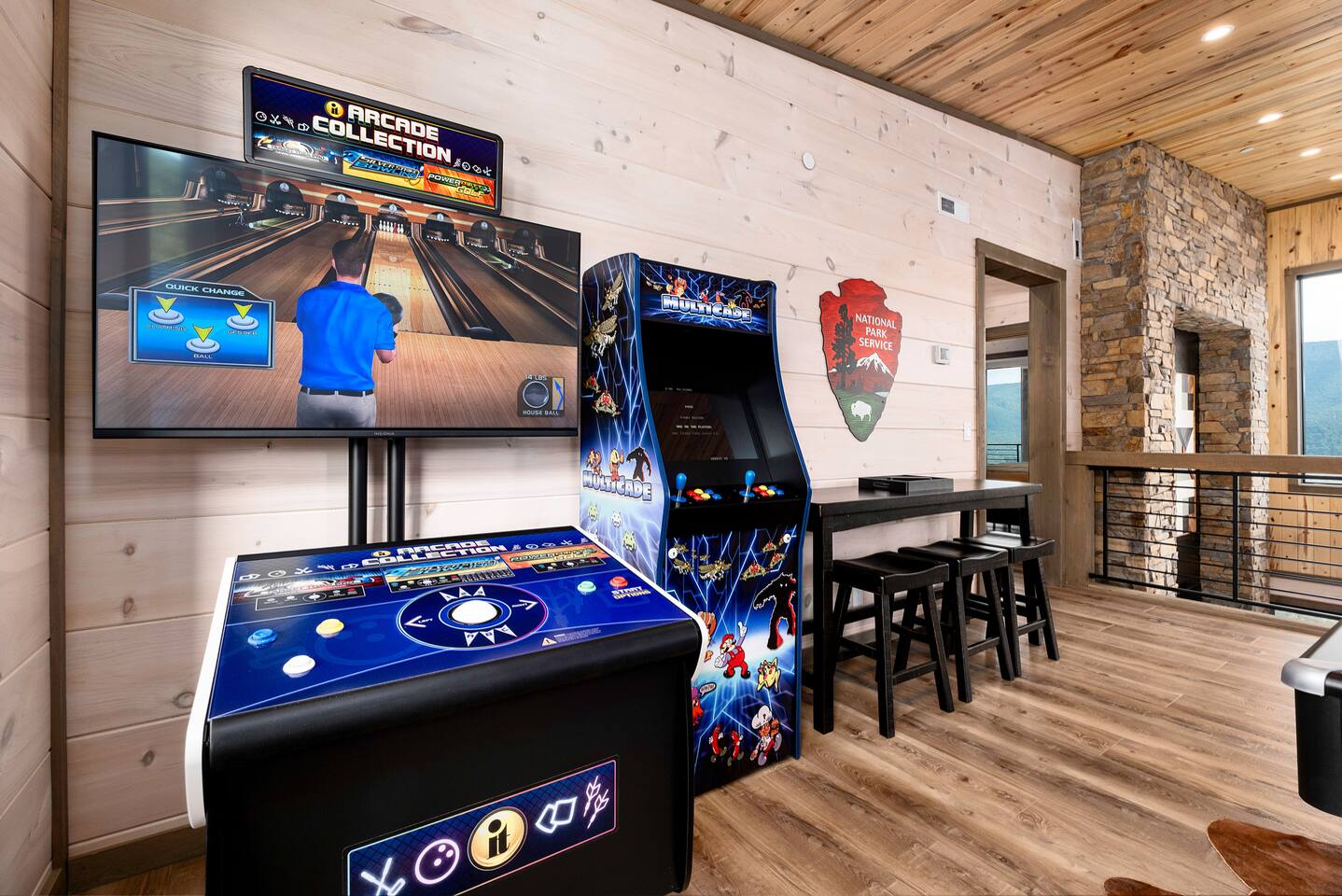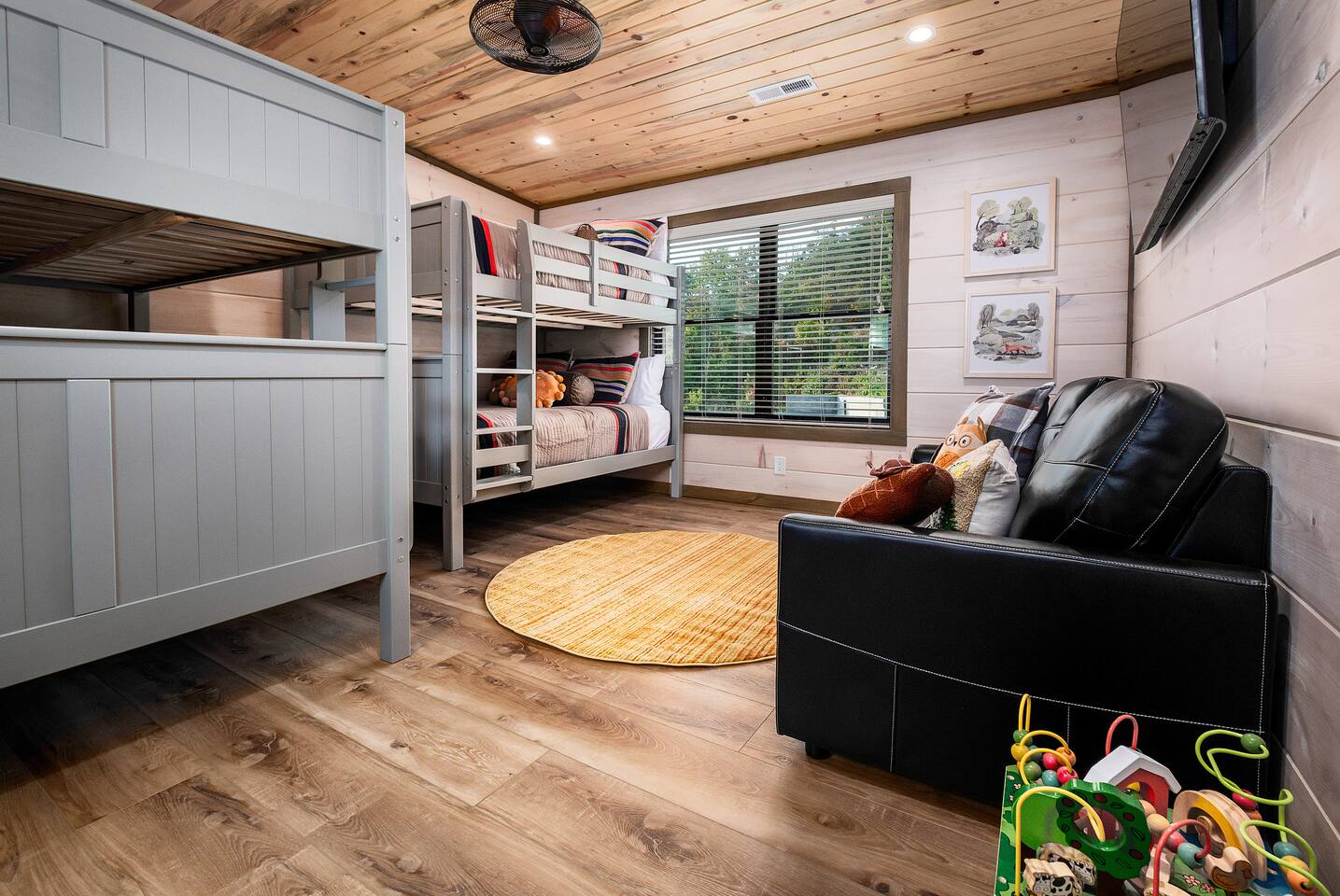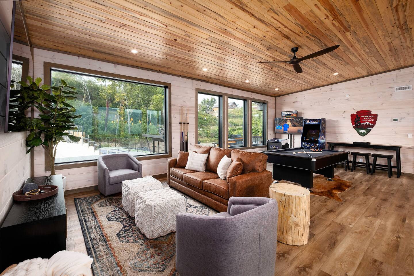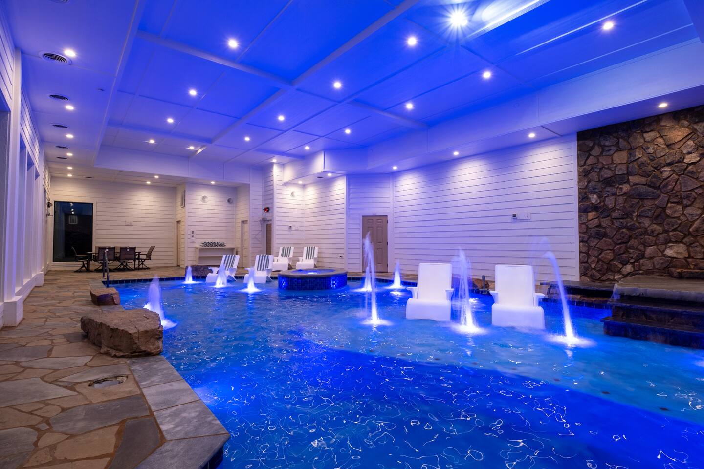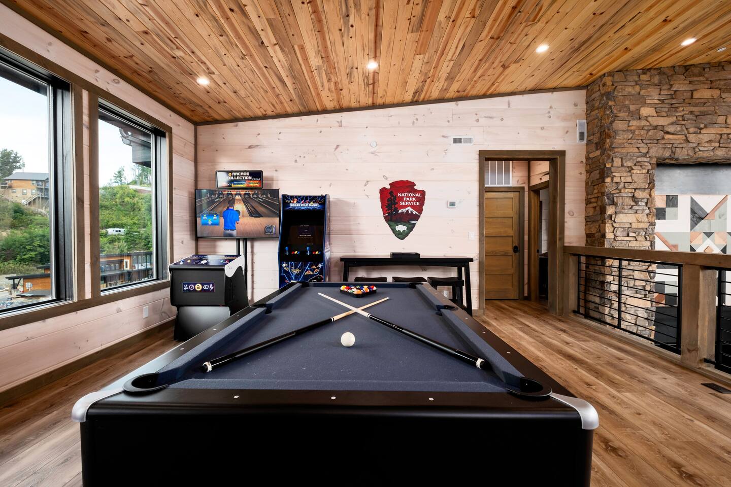 ★ 5 King Suites – Each with fireplace, spa bath (soaking tub & shower), and luxury linens ★ Bunk Room – Sleeps up to 10 kids/teens, with ensuite bath ★ 8.5 Bathrooms – No waiting for showers ★ Private Indoor Pool – One of the largest in the Smokies; lazy river, waterfall, built-in spa, kiddie pool (heated year-round, secured with coded lock & door alarm) ★ Year-Round Outdoor Swim Spa/Hot Tub – Relaxation, hydrotherapy, or resistance workouts ★ Sports Court – Regulation pickleball court (shared with basketball) & 6-hole putt-putt; court lit for night play ★ Game Loft + Media Tower – Pool table, arcade games, air hockey, big screens ★ Chef’s Kitchen – Dual appliances, oversized island, 12-seat dining table, bar seating ★ Multiple Fireplaces – 5 bedrooms + living & media rooms ★ Expansive Decks – Dining, lounge, & firepit seating with panoramic views ★ Covered Outdoor Grill Station – 12-burner gas grill, griddle, lounge area ★ Family-Friendly – High chair, pack ’n play, board games, bunk room designed for kids/teens ★ Designer-Appointed Interiors – High-end finishes and luxury linens ★ EV Charger – On-site for your convenience SLEEPING ARRANGEMENTS Main Level (No-step entry, mobility-friendly) ▪ Bedroom 1: King bed, fireplace, spa bath, deck access ▪ Bedroom 2: King bed, fireplace, spa bath ▪ Bedroom 3: King bed, fireplace, spa bath Upstairs ▪ Bedroom 4: 4 full bunks, full sofa bed, en suite bath ▪ Bedroom 5: King bed, fireplace, spa bath, private balcony ▪ Bedroom 6: King bed, fireplace, spa bath Additional Sleeping ▪ Loft: Queen sofa bed, full bath ▪ Media Tower: Queen sofa bed, private deck, full bath access ▪ Pack ’n play
