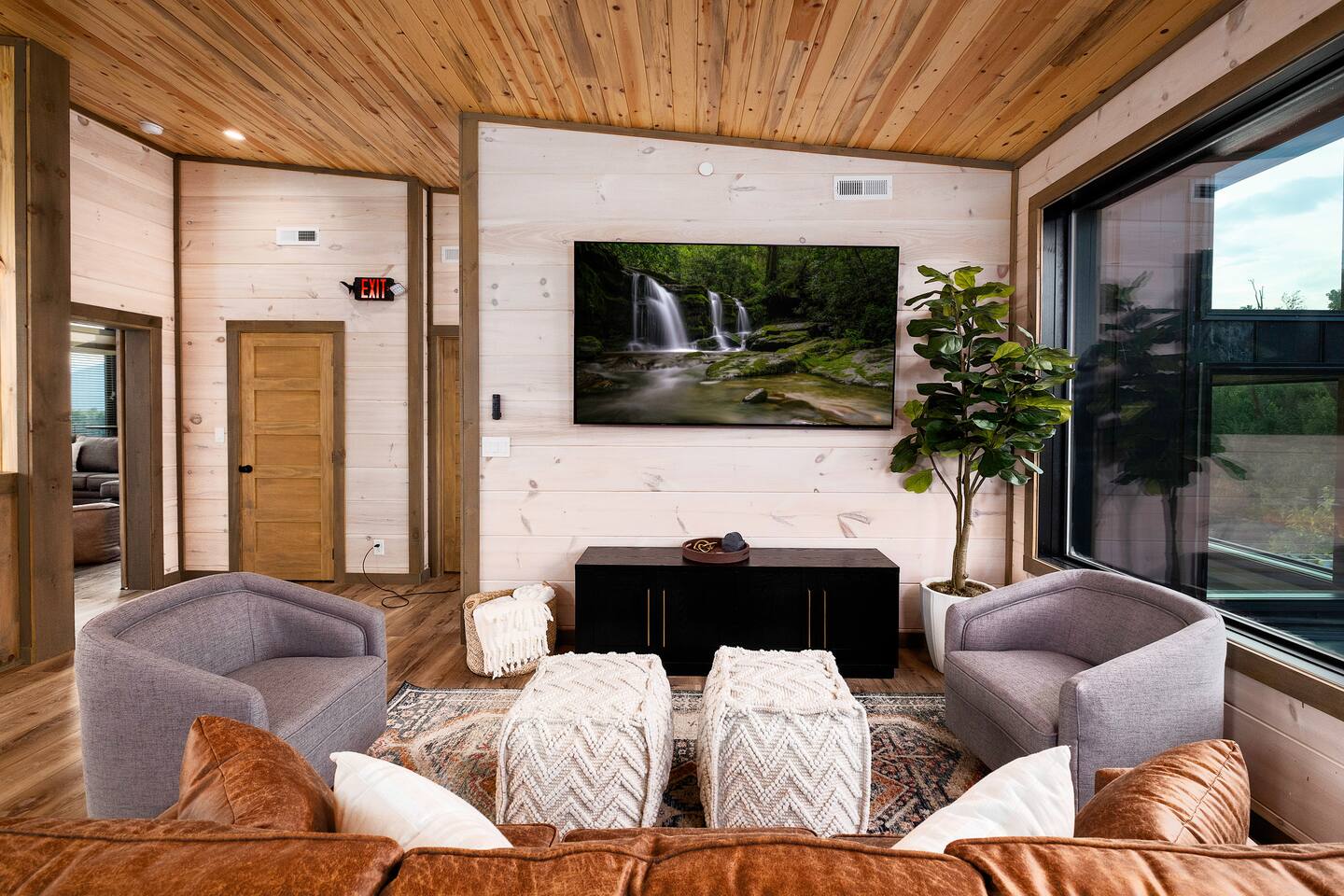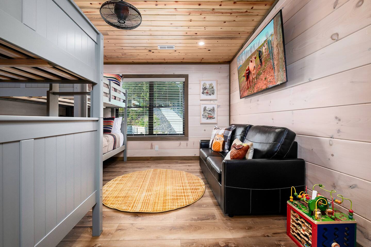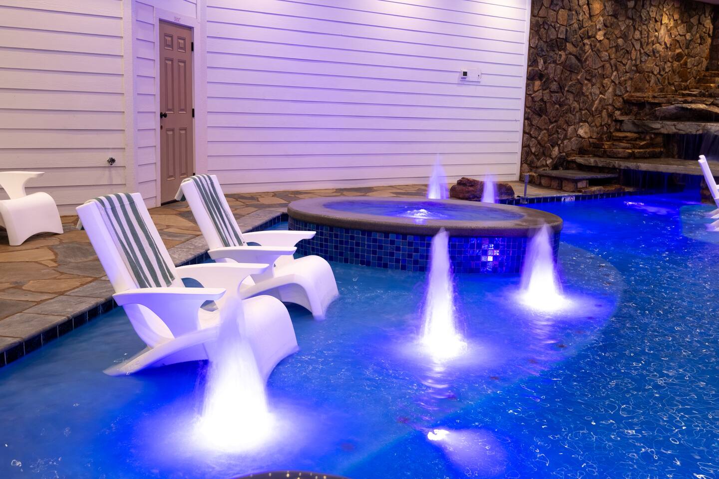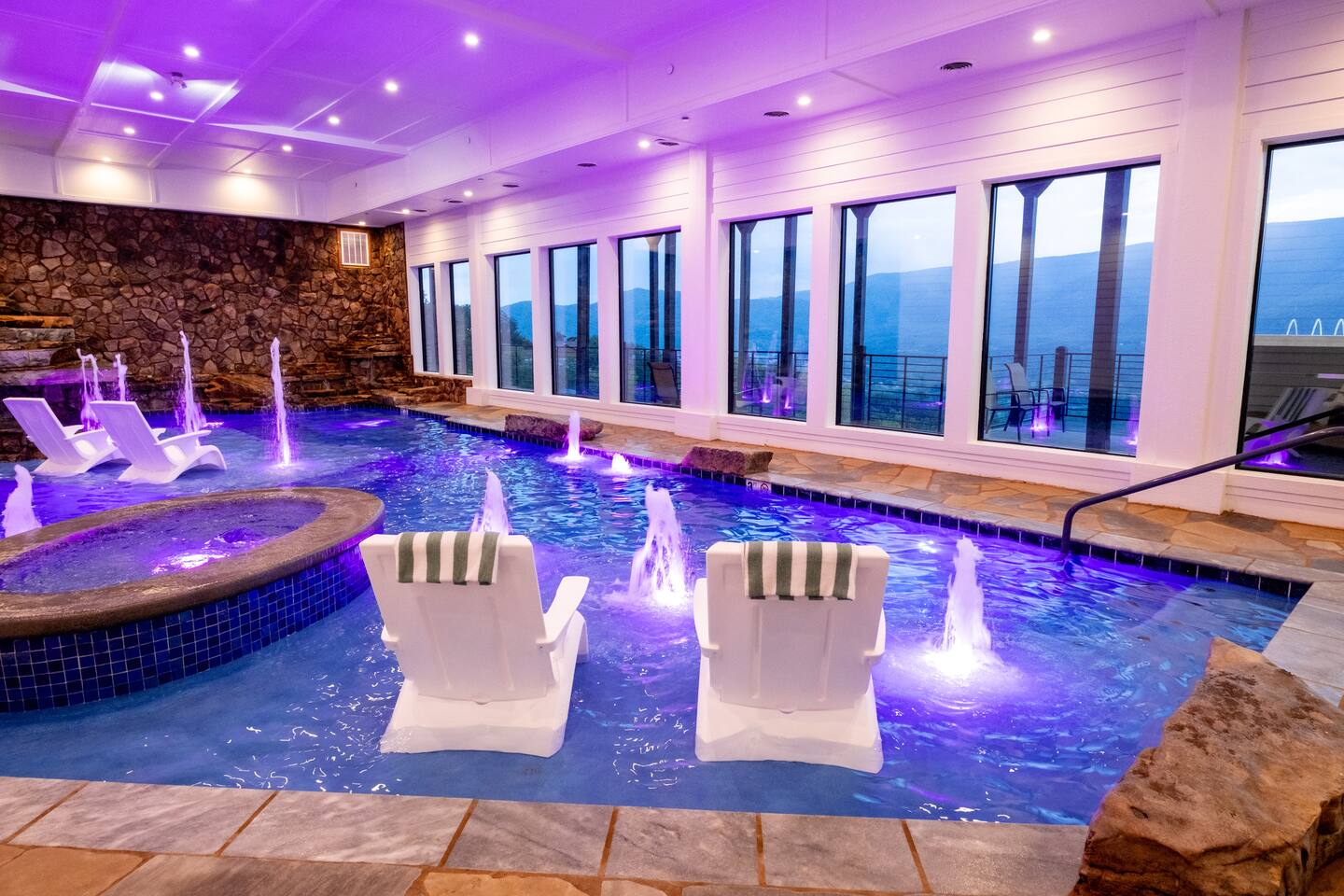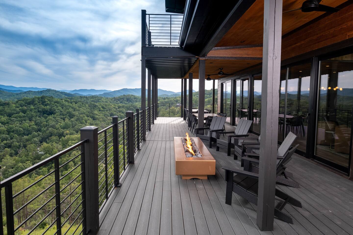 ★ 5 King Suites – Each with fireplace, spa bath (soaking tub & shower), and luxury linens ★ Bunk Room – Sleeps up to 10 kids/teens, with ensuite bath ★ 8.5 Bathrooms – No waiting for showers ★ Private Indoor Pool – One of the largest in the Smokies; lazy river, waterfall, built-in spa, kiddie pool (heated year-round, secured with coded lock & door alarm) ★ Year-Round Outdoor Swim Spa/Hot Tub – Relaxation, hydrotherapy, or resistance workouts ★ Sports Court – Regulation pickleball court (shared with basketball) & 6-hole putt-putt; court lit for night play ★ Game Loft + Media Tower – Pool table, arcade games, air hockey, big screens ★ Chef’s Kitchen – Dual appliances, oversized island, 12-seat dining table, bar seating ★ Multiple Fireplaces – 5 bedrooms + living & media rooms ★ Expansive Decks – Dining, lounge, & firepit seating with panoramic views ★ Covered Outdoor Grill Station – 12-burner gas grill, griddle, lounge area ★ Family-Friendly – High chair, pack ’n play, board games, bunk room designed for kids/teens ★ Designer-Appointed Interiors – High-end finishes and luxury linens ★ EV Charger – On-site for your convenience SLEEPING ARRANGEMENTS Main Level (No-step entry, mobility-friendly) ▪ Bedroom 1: King bed, fireplace, spa bath, deck access ▪ Bedroom 2: King bed, fireplace, spa bath ▪ Bedroom 3: King bed, fireplace, spa bath Upstairs ▪ Bedroom 4: 4 full bunks, full sofa bed, en suite bath ▪ Bedroom 5: King bed, fireplace, spa bath, private balcony ▪ Bedroom 6: King bed, fireplace, spa bath Additional Sleeping ▪ Loft: Queen sofa bed, full bath ▪ Media Tower: Queen sofa bed, private deck, full bath access ▪ Pack ’n play