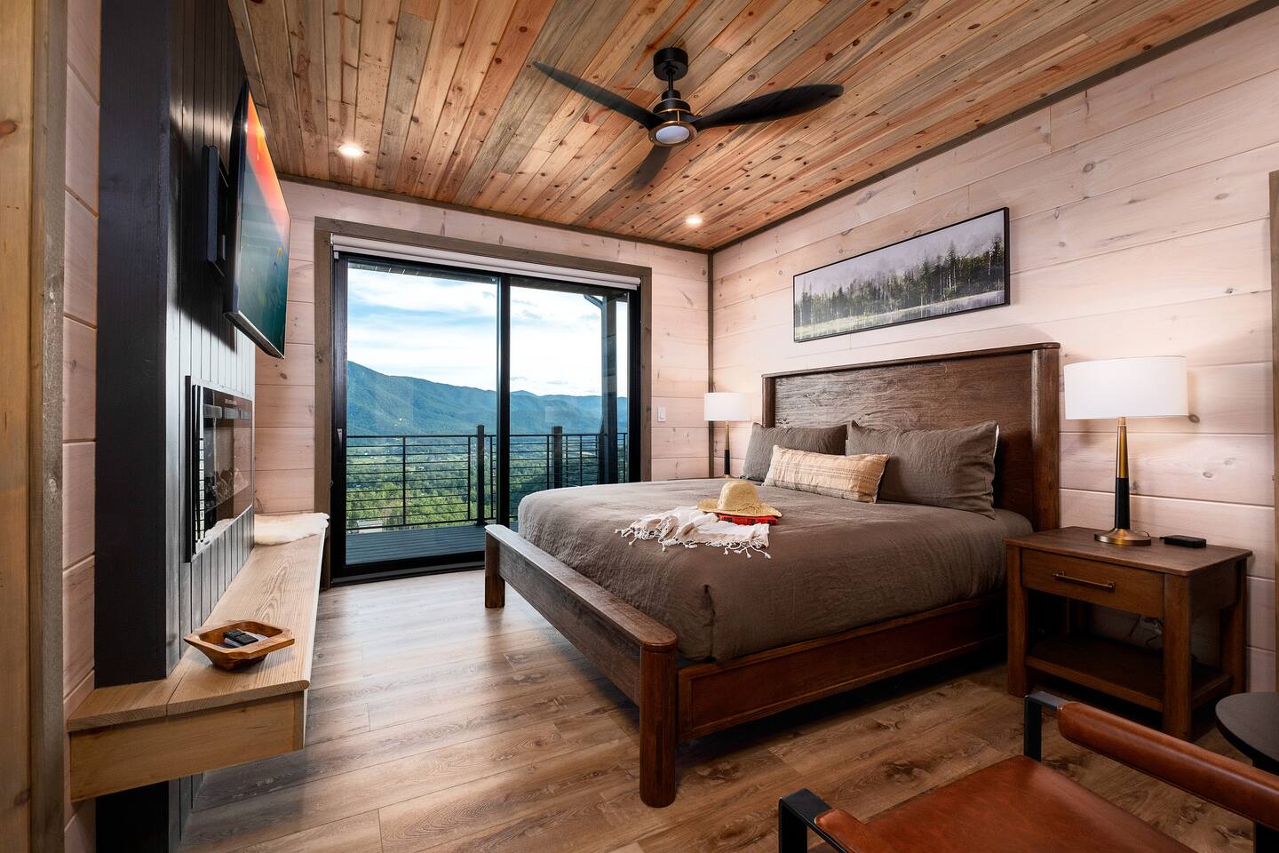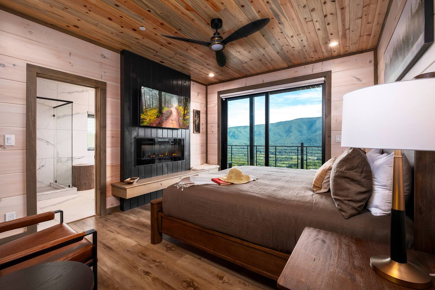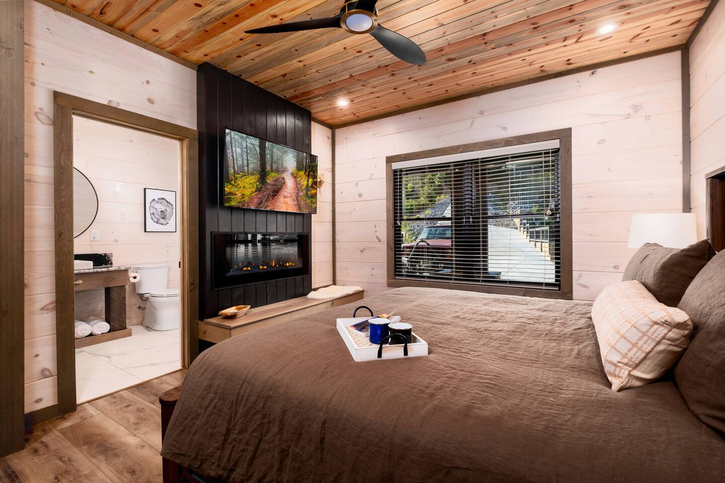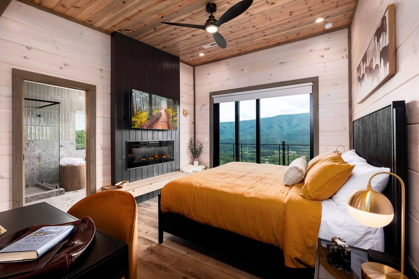 ★ 5 King Suites – Each with fireplace, spa bath (soaking tub & shower), and luxury linens ★ Bunk Room – Sleeps up to 10 kids/teens, with ensuite bath ★ 8.5 Bathrooms – No waiting for showers ★ Private Indoor Pool – One of the largest in the Smokies; lazy river, waterfall, built-in spa, kiddie pool (heated year-round, secured with coded lock & door alarm) ★ Year-Round Outdoor Swim Spa/Hot Tub – Relaxation, hydrotherapy, or resistance workouts ★ Sports Court – Regulation pickleball court (shared with basketball) & 6-hole putt-putt; court lit for night play ★ Game Loft + Media Tower – Pool table, arcade games, air hockey, big screens ★ Chef’s Kitchen – Dual appliances, oversized island, 12-seat dining table, bar seating ★ Multiple Fireplaces – 5 bedrooms + living & media rooms ★ Expansive Decks – Dining, lounge, & firepit seating with panoramic views ★ Covered Outdoor Grill Station – 12-burner gas grill, griddle, lounge area ★ Family-Friendly – High chair, pack ’n play, board games, bunk room designed for kids/teens ★ Designer-Appointed Interiors – High-end finishes and luxury linens ★ EV Charger – On-site for your convenience SLEEPING ARRANGEMENTS Main Level (No-step entry, mobility-friendly) ▪ Bedroom 1: King bed, fireplace, spa bath, deck access ▪ Bedroom 2: King bed, fireplace, spa bath ▪ Bedroom 3: King bed, fireplace, spa bath Upstairs ▪ Bedroom 4: 4 full bunks, full sofa bed, en suite bath ▪ Bedroom 5: King bed, fireplace, spa bath, private balcony ▪ Bedroom 6: King bed, fireplace, spa bath Additional Sleeping ▪ Loft: Queen sofa bed, full bath ▪ Media Tower: Queen sofa bed, private deck, full bath access ▪ Pack ’n play
