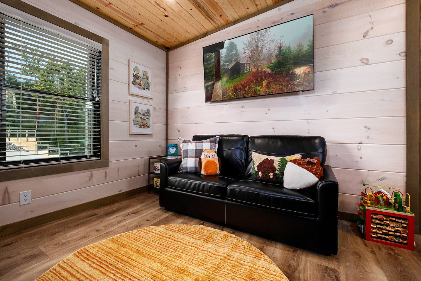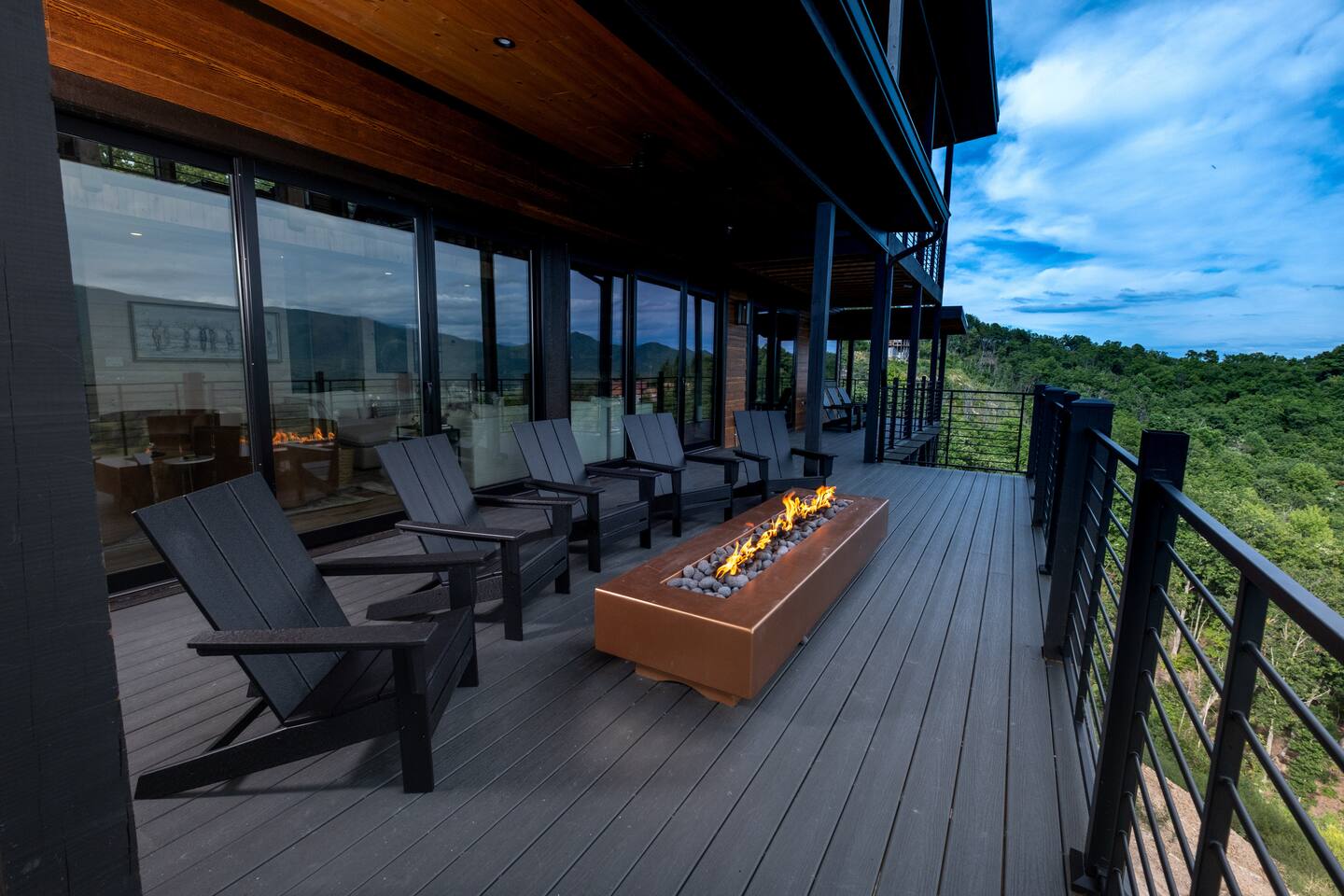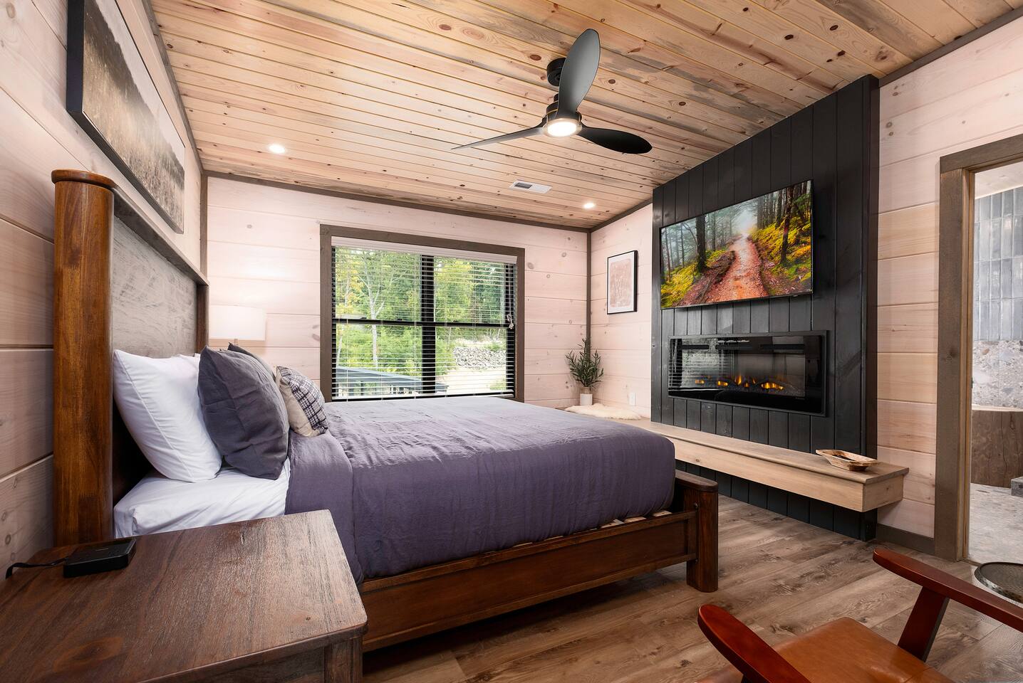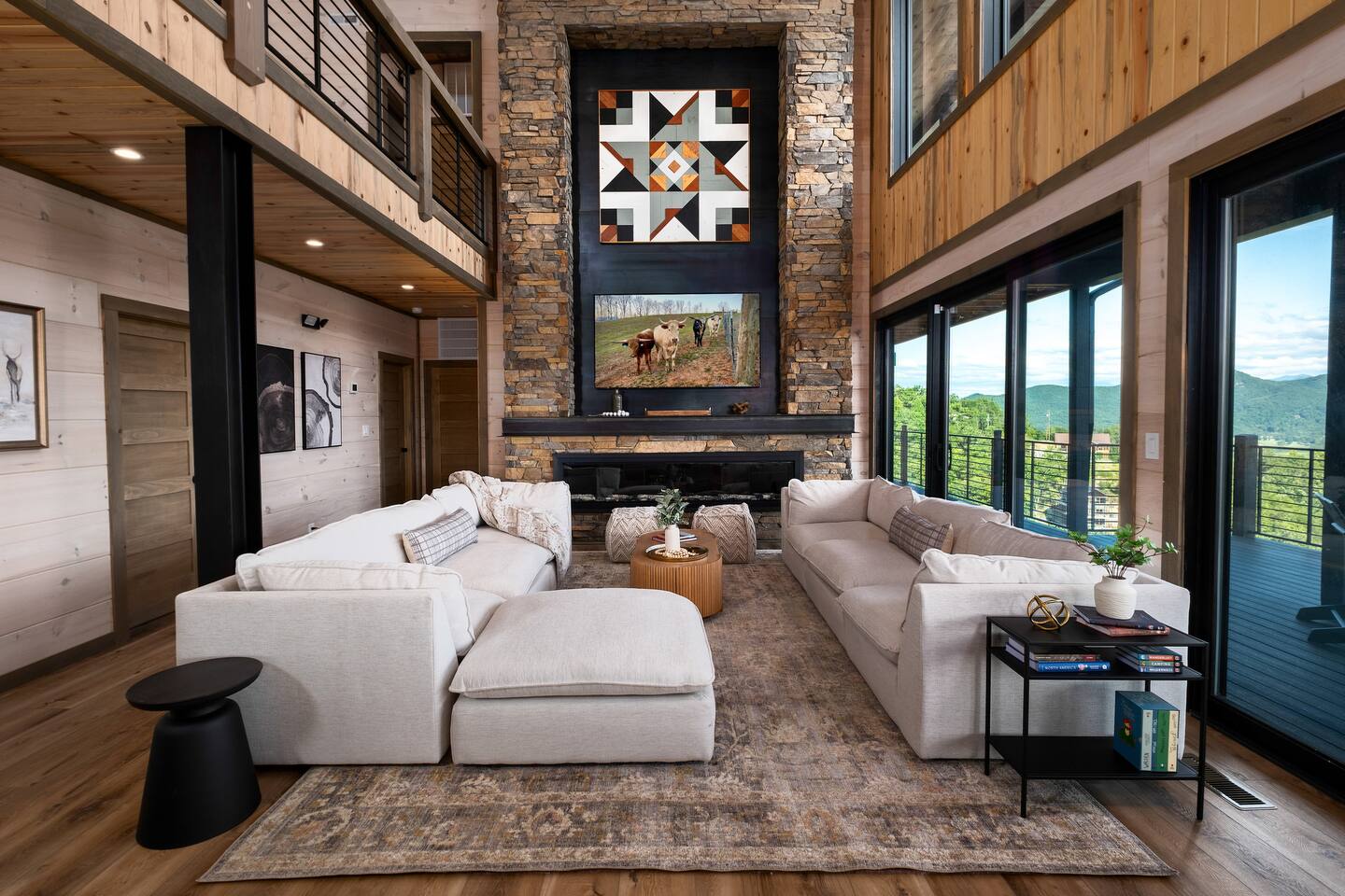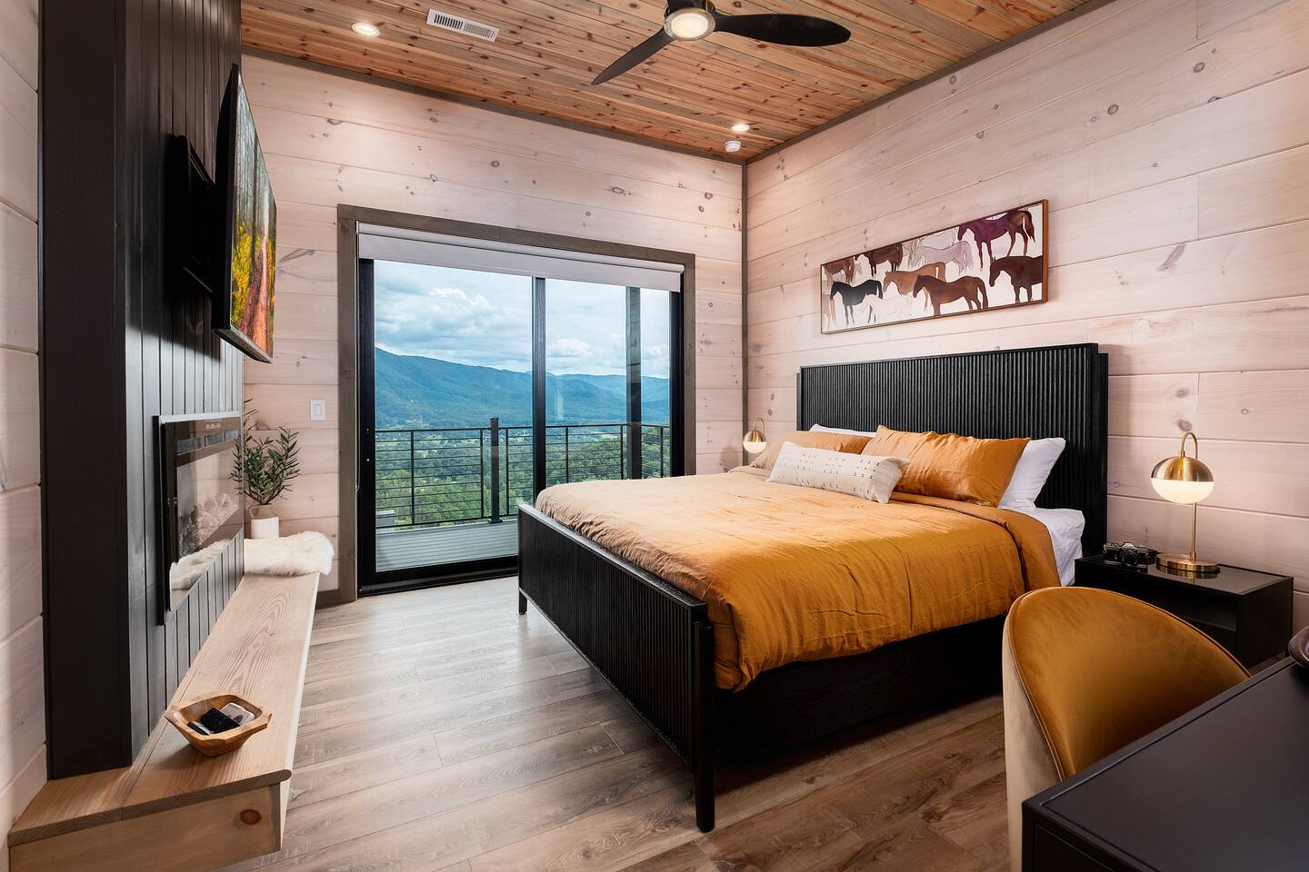 ★ 5 King Suites – Each with fireplace, spa bath (soaking tub & shower), and luxury linens ★ Bunk Room – Sleeps up to 10 kids/teens, with ensuite bath ★ 8.5 Bathrooms – No waiting for showers ★ Private Indoor Pool – One of the largest in the Smokies; lazy river, waterfall, built-in spa, kiddie pool (heated year-round, secured with coded lock & door alarm) ★ Year-Round Outdoor Swim Spa/Hot Tub – Relaxation, hydrotherapy, or resistance workouts ★ Sports Court – Regulation pickleball court (shared with basketball) & 6-hole putt-putt; court lit for night play ★ Game Loft + Media Tower – Pool table, arcade games, air hockey, big screens ★ Chef’s Kitchen – Dual appliances, oversized island, 12-seat dining table, bar seating ★ Multiple Fireplaces – 5 bedrooms + living & media rooms ★ Expansive Decks – Dining, lounge, & firepit seating with panoramic views ★ Covered Outdoor Grill Station – 12-burner gas grill, griddle, lounge area ★ Family-Friendly – High chair, pack ’n play, board games, bunk room designed for kids/teens ★ Designer-Appointed Interiors – High-end finishes and luxury linens ★ EV Charger – On-site for your convenience SLEEPING ARRANGEMENTS Main Level (No-step entry, mobility-friendly) ▪ Bedroom 1: King bed, fireplace, spa bath, deck access ▪ Bedroom 2: King bed, fireplace, spa bath ▪ Bedroom 3: King bed, fireplace, spa bath Upstairs ▪ Bedroom 4: 4 full bunks, full sofa bed, en suite bath ▪ Bedroom 5: King bed, fireplace, spa bath, private balcony ▪ Bedroom 6: King bed, fireplace, spa bath Additional Sleeping ▪ Loft: Queen sofa bed, full bath ▪ Media Tower: Queen sofa bed, private deck, full bath access ▪ Pack ’n play