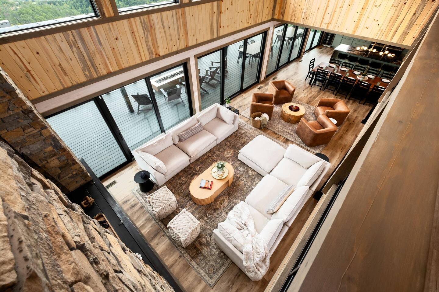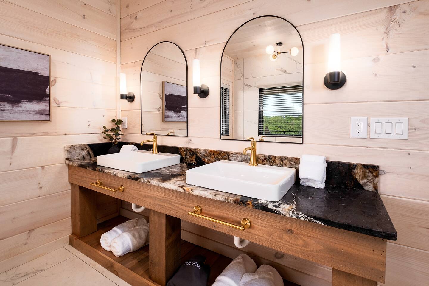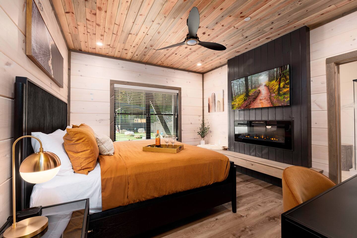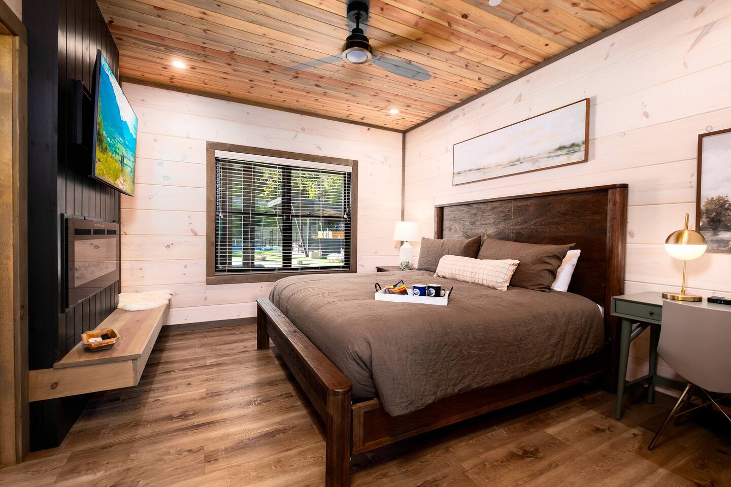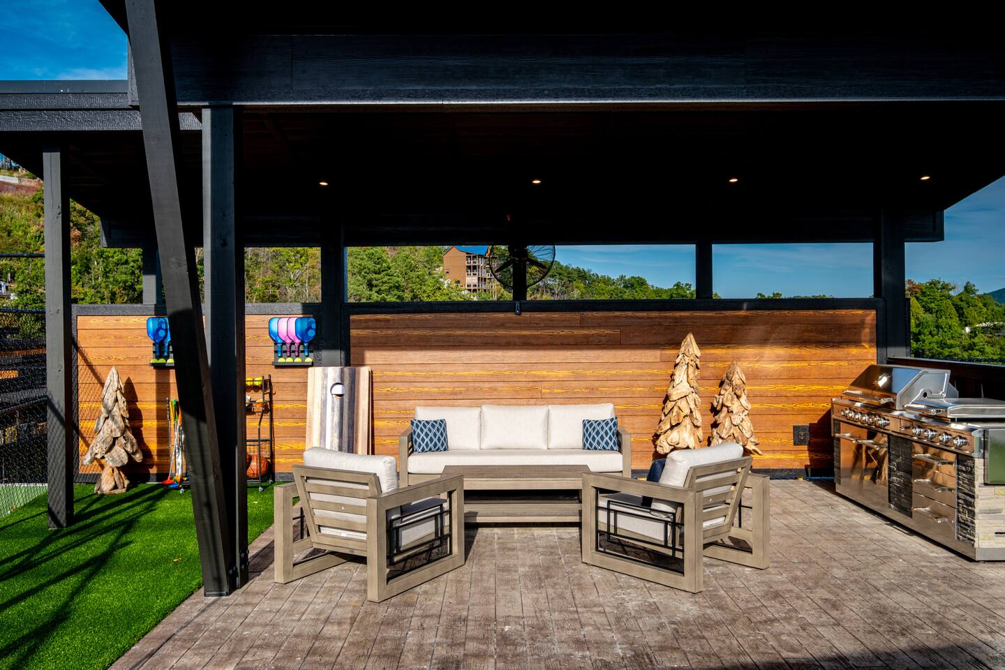 ★ 5 King Suites – Each with fireplace, spa bath (soaking tub & shower), and luxury linens ★ Bunk Room – Sleeps up to 10 kids/teens, with ensuite bath ★ 8.5 Bathrooms – No waiting for showers ★ Private Indoor Pool – One of the largest in the Smokies; lazy river, waterfall, built-in spa, kiddie pool (heated year-round, secured with coded lock & door alarm) ★ Year-Round Outdoor Swim Spa/Hot Tub – Relaxation, hydrotherapy, or resistance workouts ★ Sports Court – Regulation pickleball court (shared with basketball) & 6-hole putt-putt; court lit for night play ★ Game Loft + Media Tower – Pool table, arcade games, air hockey, big screens ★ Chef’s Kitchen – Dual appliances, oversized island, 12-seat dining table, bar seating ★ Multiple Fireplaces – 5 bedrooms + living & media rooms ★ Expansive Decks – Dining, lounge, & firepit seating with panoramic views ★ Covered Outdoor Grill Station – 12-burner gas grill, griddle, lounge area ★ Family-Friendly – High chair, pack ’n play, board games, bunk room designed for kids/teens ★ Designer-Appointed Interiors – High-end finishes and luxury linens ★ EV Charger – On-site for your convenience SLEEPING ARRANGEMENTS Main Level (No-step entry, mobility-friendly) ▪ Bedroom 1: King bed, fireplace, spa bath, deck access ▪ Bedroom 2: King bed, fireplace, spa bath ▪ Bedroom 3: King bed, fireplace, spa bath Upstairs ▪ Bedroom 4: 4 full bunks, full sofa bed, en suite bath ▪ Bedroom 5: King bed, fireplace, spa bath, private balcony ▪ Bedroom 6: King bed, fireplace, spa bath Additional Sleeping ▪ Loft: Queen sofa bed, full bath ▪ Media Tower: Queen sofa bed, private deck, full bath access ▪ Pack ’n play