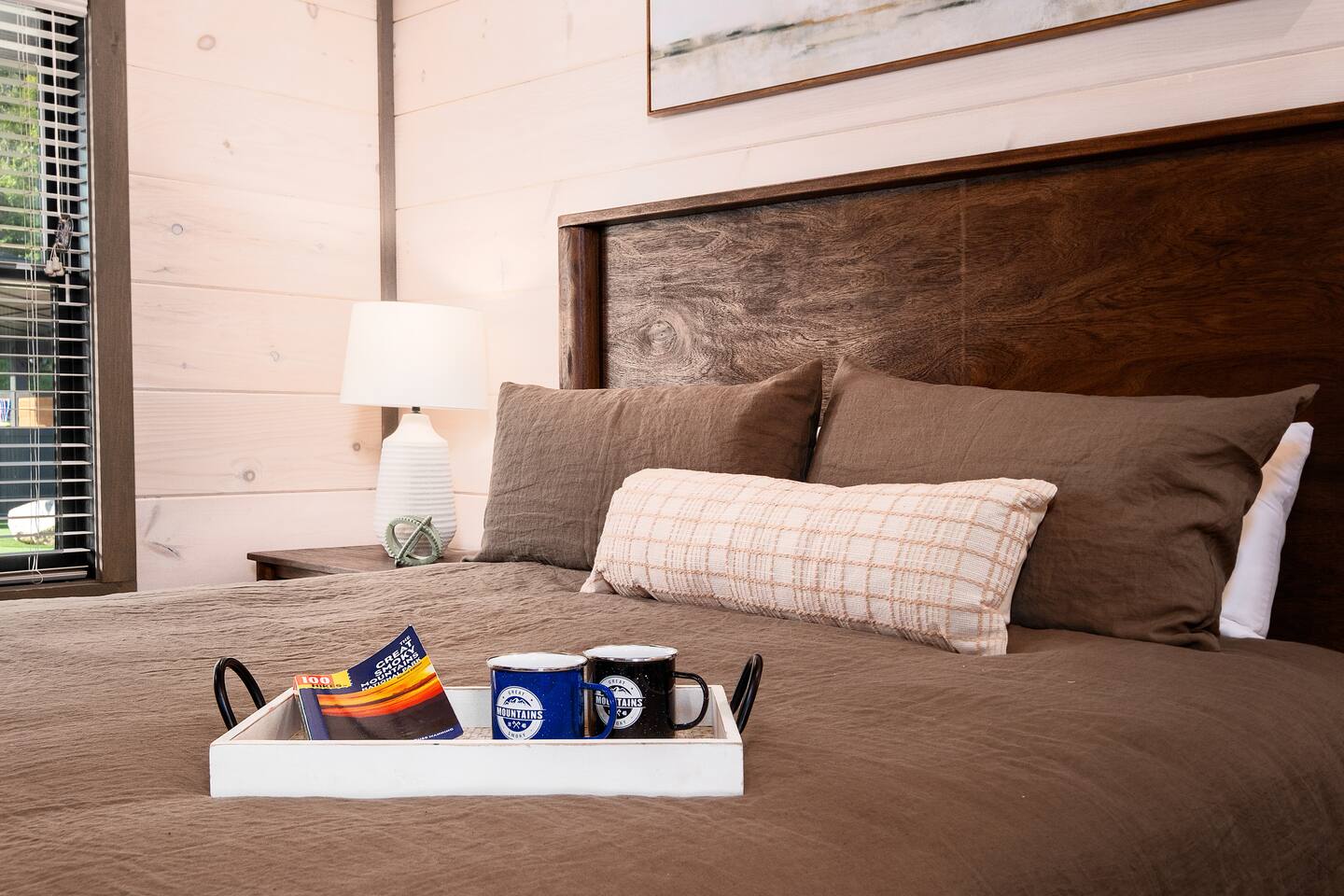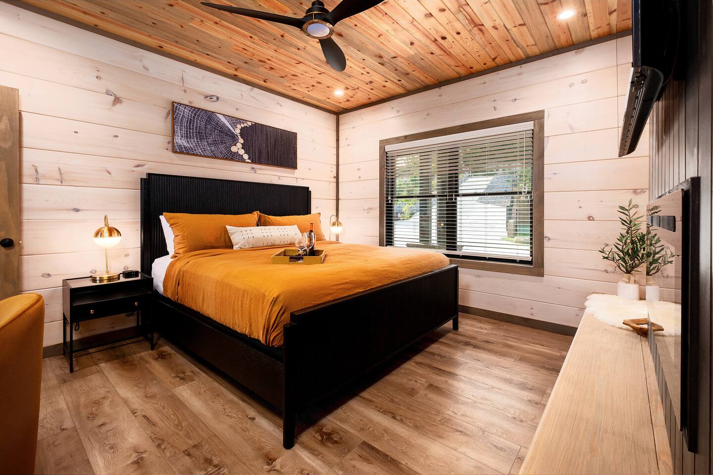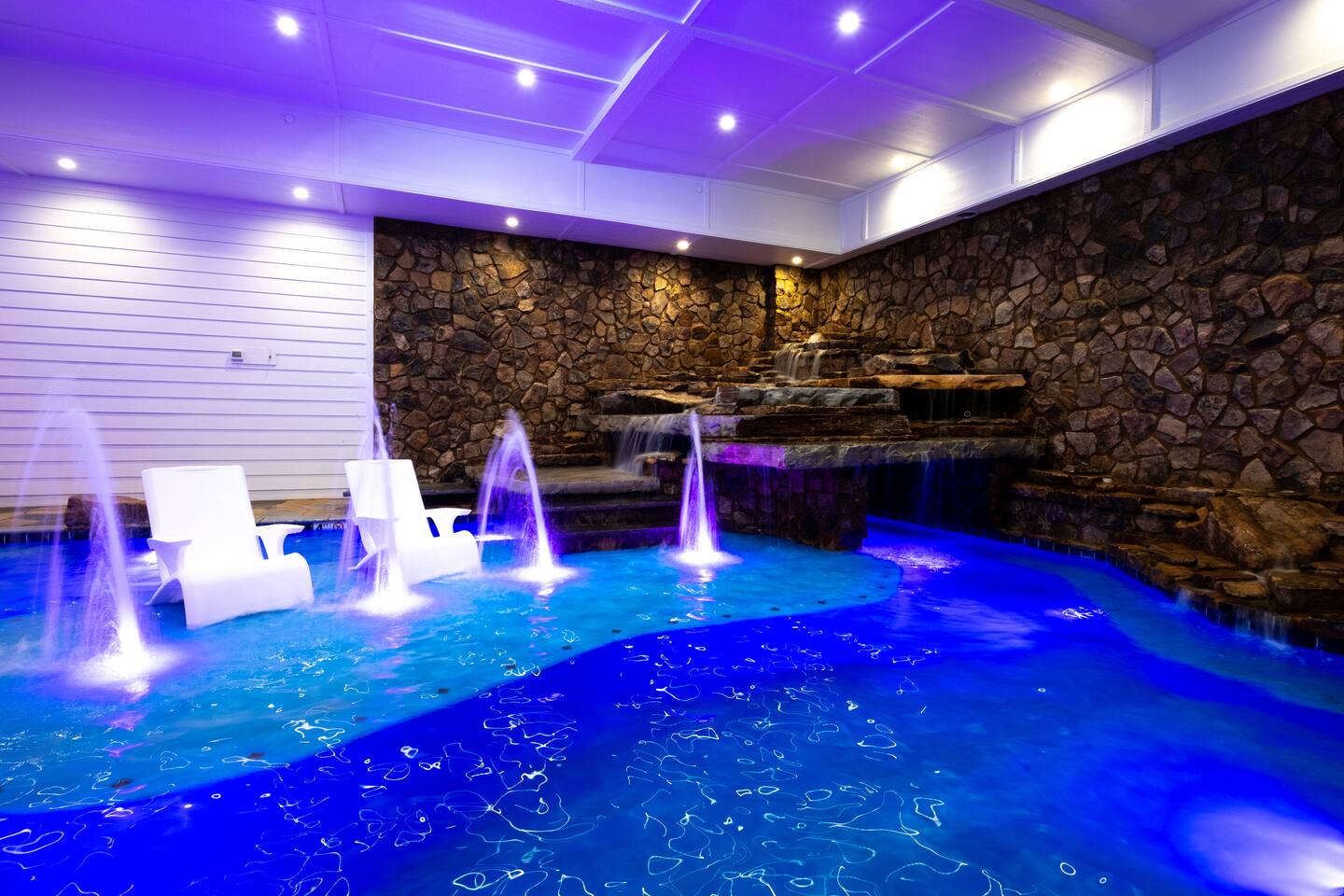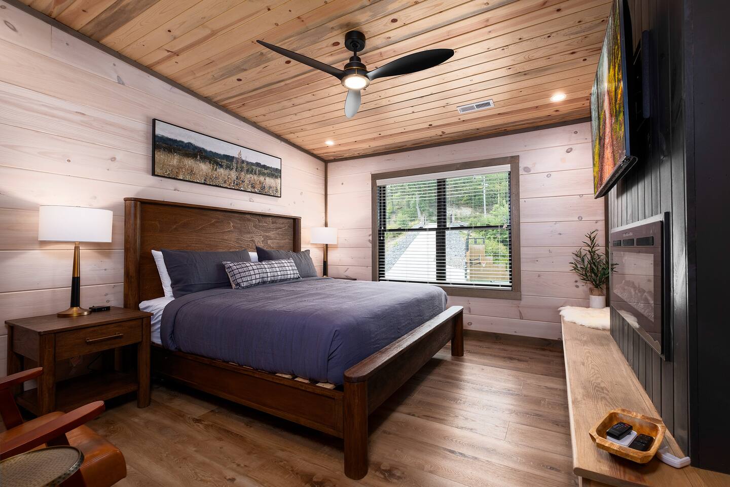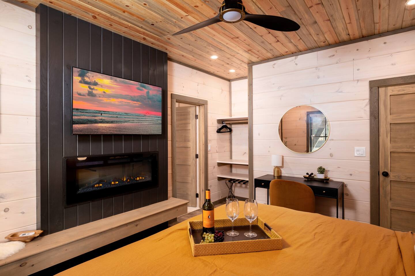 ★ 5 King Suites – Each with fireplace, spa bath (soaking tub & shower), and luxury linens ★ Bunk Room – Sleeps up to 10 kids/teens, with ensuite bath ★ 8.5 Bathrooms – No waiting for showers ★ Private Indoor Pool – One of the largest in the Smokies; lazy river, waterfall, built-in spa, kiddie pool (heated year-round, secured with coded lock & door alarm) ★ Year-Round Outdoor Swim Spa/Hot Tub – Relaxation, hydrotherapy, or resistance workouts ★ Sports Court – Regulation pickleball court (shared with basketball) & 6-hole putt-putt; court lit for night play ★ Game Loft + Media Tower – Pool table, arcade games, air hockey, big screens ★ Chef’s Kitchen – Dual appliances, oversized island, 12-seat dining table, bar seating ★ Multiple Fireplaces – 5 bedrooms + living & media rooms ★ Expansive Decks – Dining, lounge, & firepit seating with panoramic views ★ Covered Outdoor Grill Station – 12-burner gas grill, griddle, lounge area ★ Family-Friendly – High chair, pack ’n play, board games, bunk room designed for kids/teens ★ Designer-Appointed Interiors – High-end finishes and luxury linens ★ EV Charger – On-site for your convenience SLEEPING ARRANGEMENTS Main Level (No-step entry, mobility-friendly) ▪ Bedroom 1: King bed, fireplace, spa bath, deck access ▪ Bedroom 2: King bed, fireplace, spa bath ▪ Bedroom 3: King bed, fireplace, spa bath Upstairs ▪ Bedroom 4: 4 full bunks, full sofa bed, en suite bath ▪ Bedroom 5: King bed, fireplace, spa bath, private balcony ▪ Bedroom 6: King bed, fireplace, spa bath Additional Sleeping ▪ Loft: Queen sofa bed, full bath ▪ Media Tower: Queen sofa bed, private deck, full bath access ▪ Pack ’n play